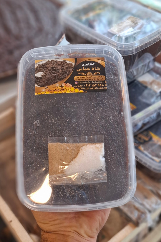 حلوا سیاه کره ای پخت مخلوط با کره محلی و روغن نباتی که یک میان وعده ارگانیک ،بهداشتی ،مقوی و بسیار خوشمزه هست و معروف ترین سوغاتی اردبیل به حساب میاد و بسیار معروف و پرطرفداره و ترکیباتش از مواد اولیه کاملا طبیعی و ارگانیک پخته میشه که شامل جوانه گندم ،آرد سبوسدار ، کره حیوانی (محلی اردبیل) و روغن نباتی،شکر،ادویه (هر حلوا پزی یه ترکیب داره بهتون اطمینان میدم رو ادویه حلوا پزی شاه عباس هیچ ادویه ای نیست چرا که ترکیبی از ۲۱ نوع ادویست) ، به مدت ۶ساعت داخل دیگ های مسی (تیان اسم محلی) پخته میشه و هیچ مواد نگهدارنده و غیر مجاز در حلوا پزی شاه عباس استفاده نمیشه . این خوراکی خوشمزه بسیار توصیه میشه برای افرادی که بیماری رماتیسم دارن یا از درد مفصل ها رنج میبرن و افراد لاغر، افرادی که ریزش مو دارن استفاده کنن کودکان طرفدرا اصلی این خوراکی هستن چرا که خوشمزه و بسیار مقوی هست تاریخچه این محصول به زمان سلسله صفویان بر میگرده که در اردبیل پخته میشده به خصوص در فصل زمستان و سرمای اردبیل این خوراکی بدلیل دارا بود ادویه و طبع گرمی بودن اون بسیار بین مردم و ارتشیان شاه اسماعیل وشاه عباس اول پر طرفدار بوده